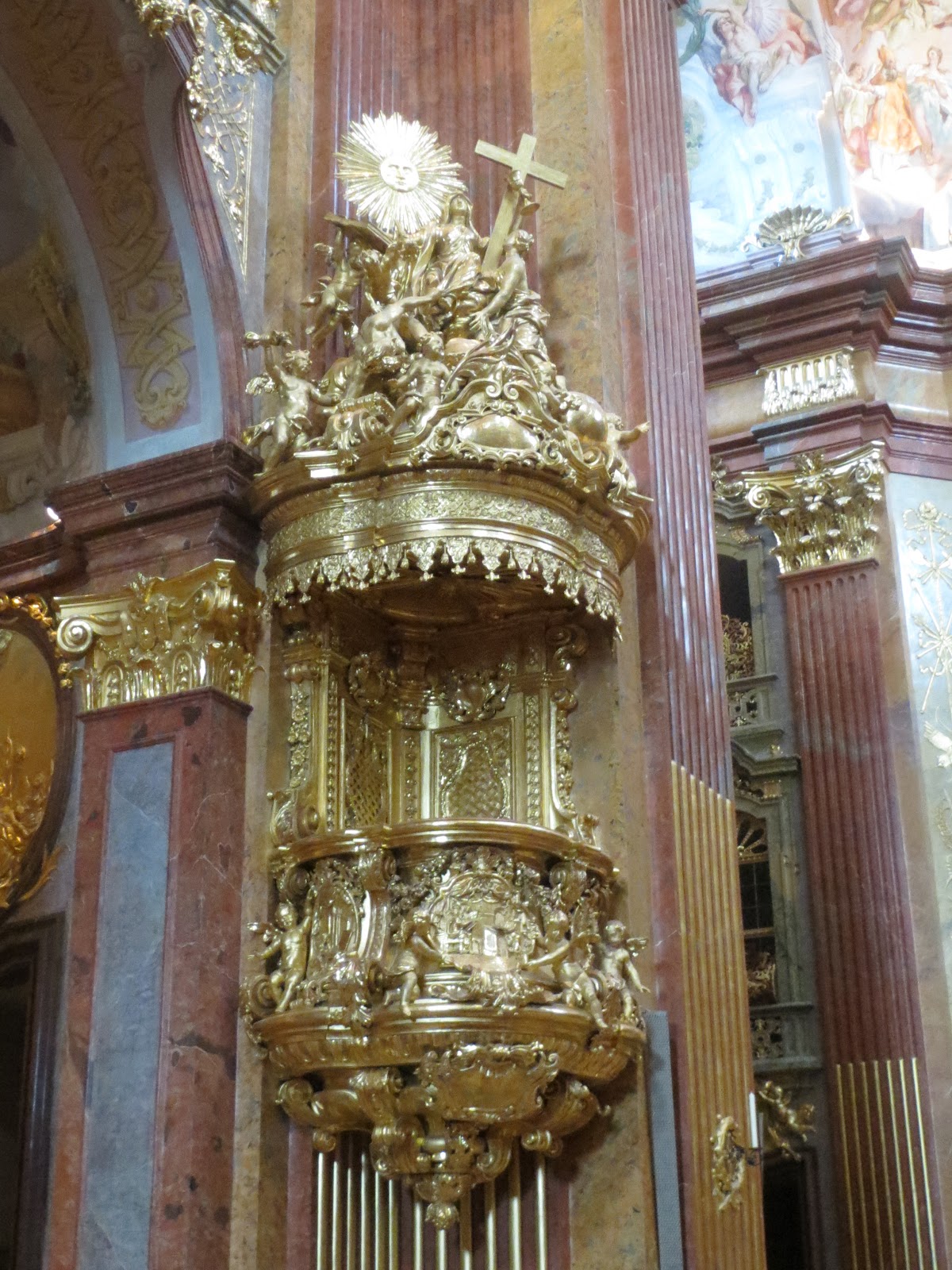 We saw many of these antique, ornate vestments not only in Melk, but also several other places.  This one is 18th century, made of silk and embroidered with gold thread.